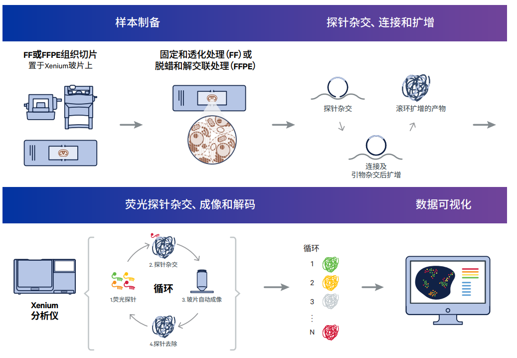 荧光探针杂交与成像:Xenium载玻片放置到Xenium 分析仪中进行荧光探针杂、循环成像、解码和数据分析,从而在切片原位获得目标基因的转录组图谱