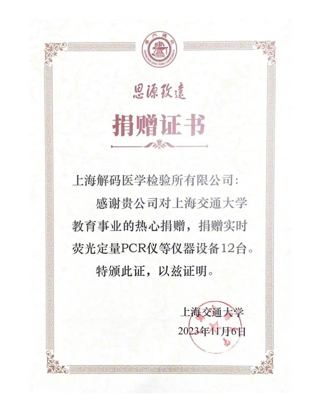 2023年11月06日,解码生物向上海交通大学生命科学技术学院捐赠大批先进实验设备,用于支持学校的教学和科研建设,助力解码创始人潘加奎的母校科技创新和人才培养,为生命科学事业做出更大贡献。