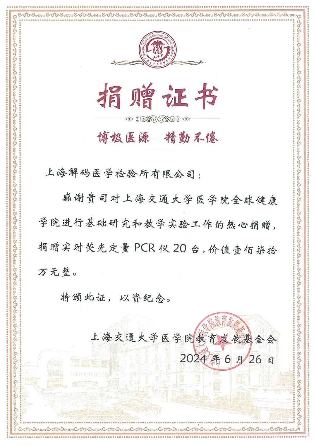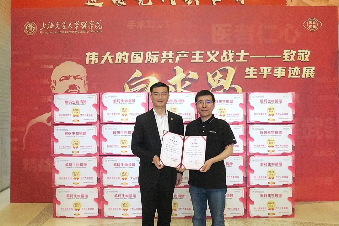2024年6月26日,解码生物向上海交通大学医学院全球健康学院捐赠了20台先进的实时荧光定量PCR仪器,总价值高达壹佰柒拾万元人民币。此举体现解码生物对生命科学基础研究和公益教育事业的高度重视,以及对公司使命“解开生命密码、守护人类健康”的坚定承诺。