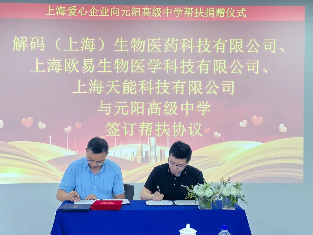 2023年6月1日,在六一儿童节当天,“上海爱心企业向元阳高级中学帮扶捐赠仪式”于上海举行。解码DNA创始人兼CEO潘加奎、欧易生物联合创始人兼副董事长肖云平、天能科技董事长孟诚卫、元阳高级中学校长赵运高受邀加了本次定向帮扶捐赠仪式。