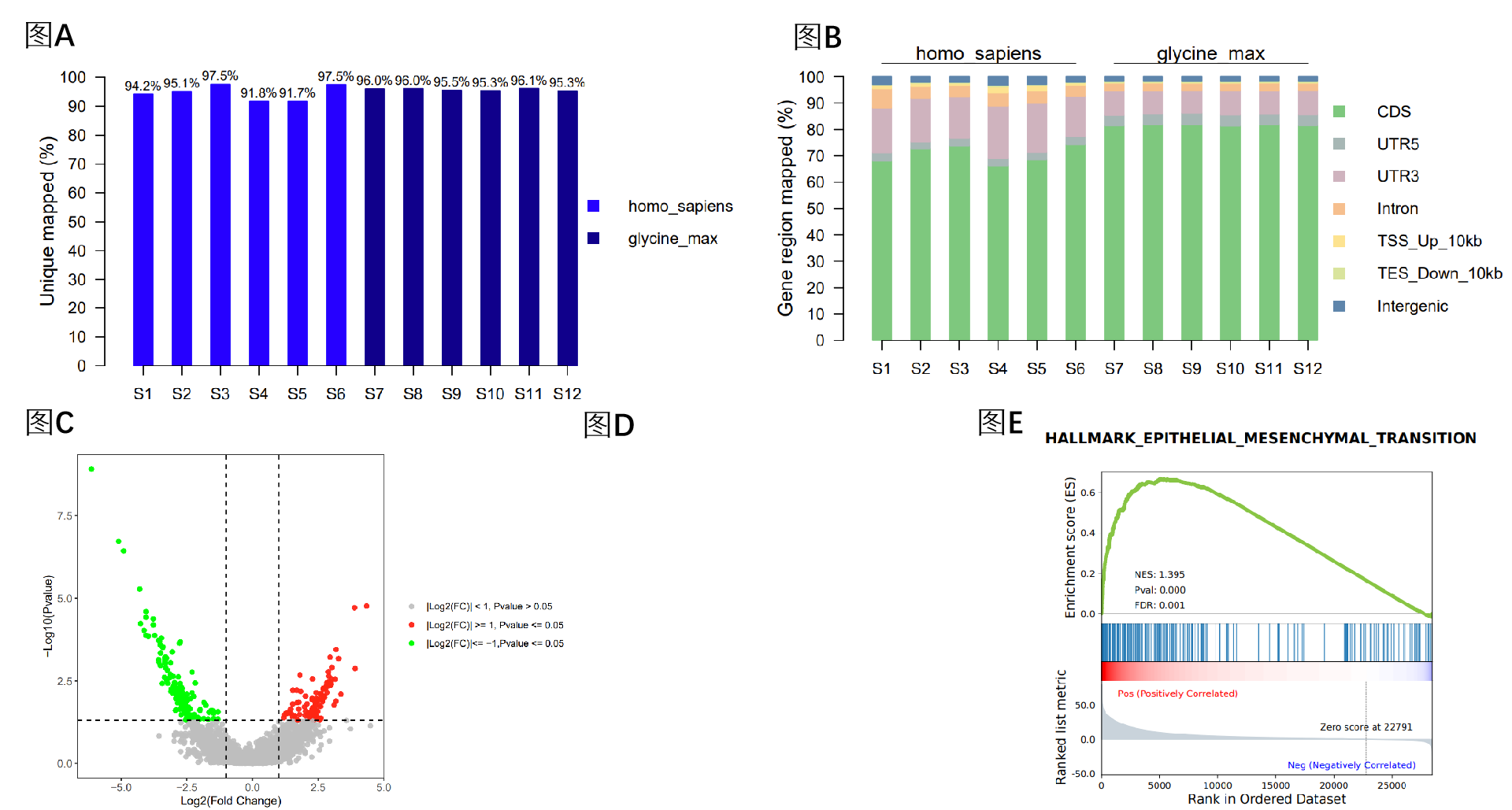 图C,两样本组间差异基因的火山图;图D,差异基因热图;图E,已知基因集的GSEA富集得分曲线图。
